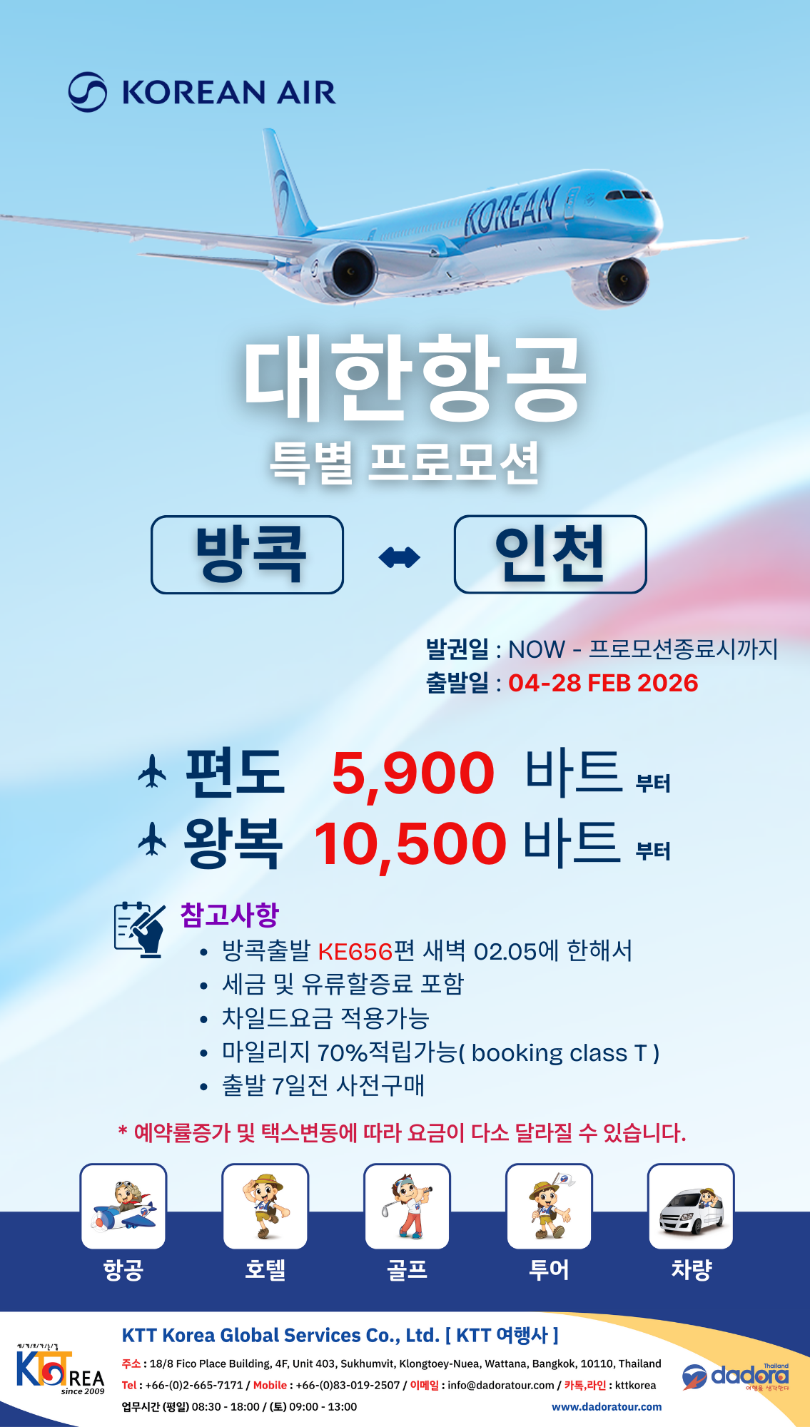109 [KTT 항공권소식] 2025년 6-7월 방콕출발 한국행 요금표! 05-27 1242