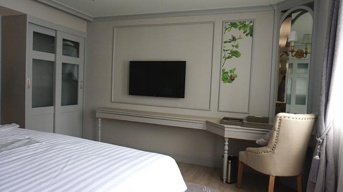 객실 한켠으로 보이는 작은 사무용 테이블과 스마트 티비가 보이는 군요!
